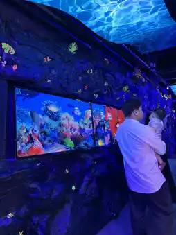 One of the most breathtaking stops: the tropical fish tanks! The Majestic Angelfish with its royal blue and yellow stripes looked straight out of a painting. We also loved the Blue Zebra Angelfish — vibrant, graceful, and super Instagrammable! The backdrop of these tanks was designed beautifully with corals and rocks, making it the perfect OOTD stop.