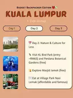 • 🦜 Visit KL Bird Park (entry ~RM63) and Perdana Botanical Gardens (free)