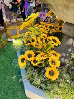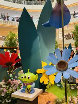 This Disney-themed floral display at Mid Valley is pure joy! Bright sunflowers, daisies, and giant pink blossoms frame the adorable Mickey and Stitch statues.