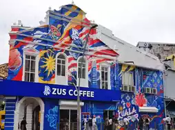 At the corner near Central Market, there’s a building that basically yells “LOOK AT ME!”—thanks to a giant mural exploding with Malaysian pride. Right under it? Zus Coffee, quietly brewing the fuel every market wanderer needs after getting lost in the labyrinth of batik shirts, keychains, and “sure-I-need-this” snacks.