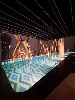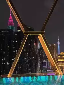 ・The Twin Towers are visible from the pool, offering a spectacular night view. 🌉
