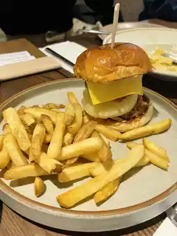 The pineapple burger 🍍 is sour and sweet and perfectly balanced. Paired with fries, it's a delicious treat!