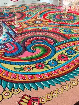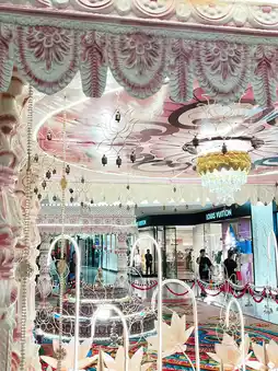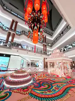 At the heart lies a magnificent mandala, glowing with vibrant hues and detailed patterns, surrounded by luminous lotus motifs that symbolise purity and enlightenment. Graceful classical dancer sculptures, frozen mid-performance, add a dynamic, soulful touch—capturing the rhythm and spirit of Deepavali. The entire scene is bathed in golden light, creating a divine atmosphere that feels both sacred and spectacular. It’s not just a decoration—it’s an immersive celebration of heritage and artistry. Truly a visual masterpiece that’s impossibly Insta-worthy and guaranteed to leave you spellbound at every turn.