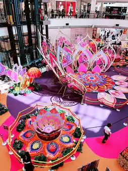 Suria KLCC’s Centre Court transforms into a radiant spectacle each Deepavali, hosting the “Enchanted Garden of Lights” — a feast for the eyes and camera. At its heart lies a grand 20‑foot kolam that illuminates and even rotates subtly in response to visitors. On either side, majestic seven‑foot peacocks stand proud, their tails stretched into 32 feet of flowing, illuminated artistry crafted from artificial flowers and coloured rice — a visual symbol of beauty, light, and tradition.