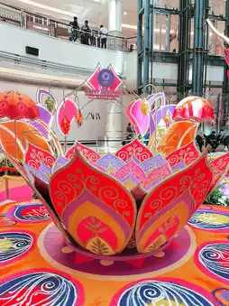 Surrounding it are elaborately decorated peacocks, lotus motifs, hanging diyas, and rich floral garlands that echo the spirit of Deepavali. The ambience is warm, spiritual, and utterly photogenic, with soft lighting that mimics the glow of thousands of oil lamps. Visitors can also explore Indian-themed stalls selling festive sweets like laddu and jalebi, savoury snacks, handmade crafts, and traditional clothing — a perfect way to experience the colours, tastes, and soul of Deepavali.
