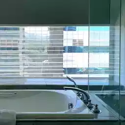 The bathroom is of a good size with nice natural lighting, a bathtub and a standing shower. Toiletries are complete too.