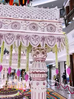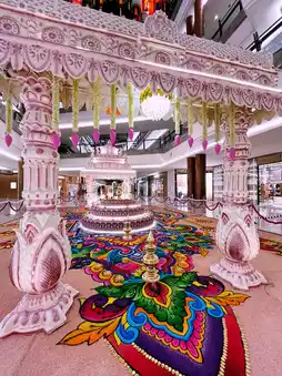 Surrounding it are towering golden arches, twinkling fairy lights, cascading marigold garlands, and glowing oil lamps (diyas) that bathe the space in a warm, magical glow. Ornate peacock motifs, rich drapes, and shimmering textiles add a regal touch. It’s more than just décor—it’s a cultural celebration, inviting visitors of all backgrounds to admire, snap photos, and soak in the joyous Deepavali atmosphere. A truly unmissable Insta-spot!