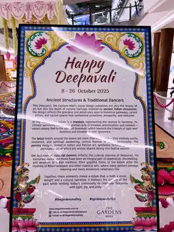 The Gardens Mall bursts into a spectacle of color, light, and tradition this Deepavali with its grand festive decorations that truly capture the spirit of the Festival of Lights. At the heart of the mall lies an elaborate, handcrafted kolam, made with vibrant hues and intricate patterns that symbolize prosperity and positivity.