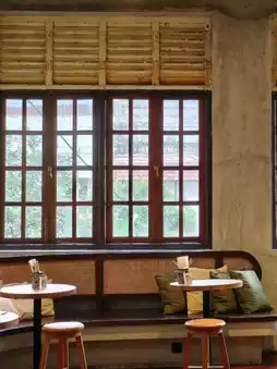 Minimalist décor with wooden tones, cozy seating, and sunlight streaming through the windows – the ideal place to unwind or snap a few Insta-worthy pics 📸