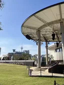 Spread your blanket on the soft grass as golden hour paints the sky in hues of orange and pink. The 118 Tower stands tall like a crystalline giant, catching the sun's final rays in a spectacular light show. 🧺✨