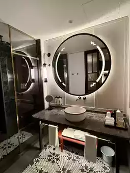 The bathroom was a highlight with its beautiful mirror lighting, perfect for makeup, strong water pressure, and impeccable cleanliness. The sink area was neatly organized, showcasing the hotel’s attention to detail.