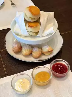 • Classic scones served with homemade jam and clotted cream.