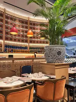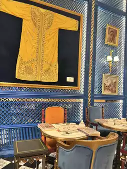 The interior feels like an oriental dream 🕌💫 with deep blue tones, golden accents, patterned tiles, and soft lighting that creates a warm refined vibe. It is one of those places where you simply want to sit, look around, and enjoy the beauty of every detail.