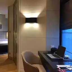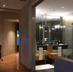 This grand deluxe suite is really spacious features powder room, coffee machine, spacious living room with sofa and dining table, walking wardrobe, lovely working desk overlooking city view, open concept bathtub and bathroom. This suite located at the corner of the building with great curving layout of the room.