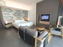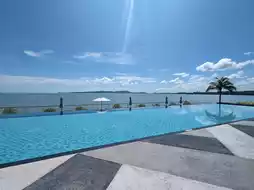 It is a lovely hotel, with an infinity pool, we had a sea view room, the bed is facing the patio doors. You can watch the sunrise/set from your bed.