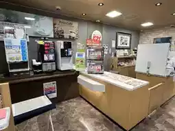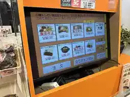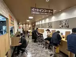 The store is lined with bento boxes, side dishes, etc., and there is an eat-in ticket machine and eat-in corner in the back.