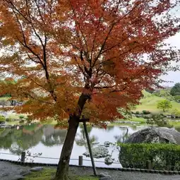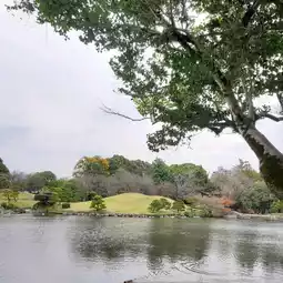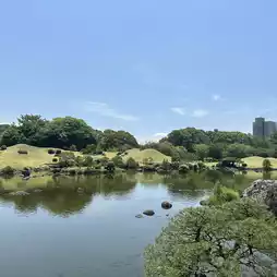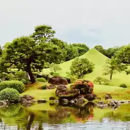 Upon entering the garden, you will find a large pond surrounded by trees, small hills, and beautifully maintained traditional Japanese landscaping.