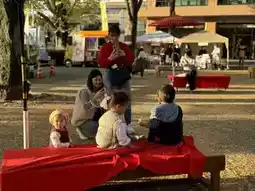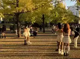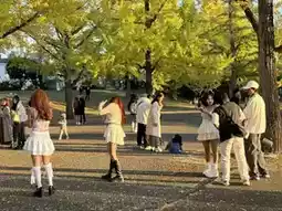 Line up to take a photo with the statue of Monkey D. Luffy, a character from One Piece, amidst a grove of bright yellow ginkgo trees. Many people come out to walk around and take photos. There are food and drink carts and a place to sit and relax.