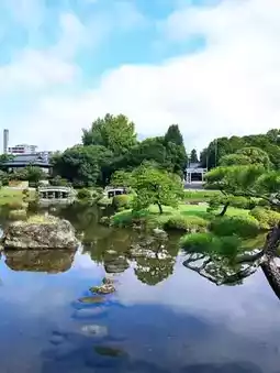 2. The garden features a picturesque lake with reflections, perfect for photography.