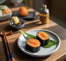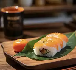 Buy "Persimmon Leaf Sushi" (Photo: Close-up of the sushi platter wrapped in green leaves).
