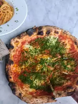 In addition to pizza, they also offer salads, pasta, cheese and ham platters, and desserts.