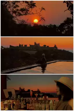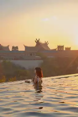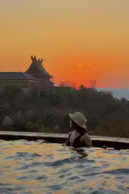 The infinity pool on the mountain top offers views of the sunset over Dian Lake.