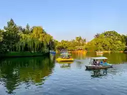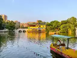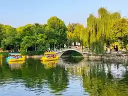 The park features various attractions such as Biyi Pavilion, Haixin Pavilion, Jiulongchi, Guanyu Pavilion, and Lotus Zen Garden. It offers a unique landscape described as 'a world of lotus flowers and fish, a splendid city with willows and pagodas.' The serene lake, lined with trees and ancient architecture, makes it a perfect spot for photography. Visitors can leisurely stroll through the greenery and capture beautiful moments, making it an ideal place for relaxation.