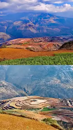 2. Jinxiu Garden: The view is incredibly expansive. The layered red land unfolds like a giant tapestry, and the crops 🌾 in the fields are like exquisite patterns embroidered on the carpet. Come in the early morning or evening to see the changing light and shadow cast a dreamy veil over the land. Every shot is a winner.