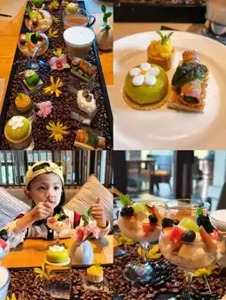 The afternoon tea is very elegant with mousse cakes, cookies, coffee, and fruit—enjoying it with family is completely satisfying!