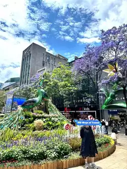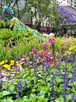 In the middle of Nanping Street in Kunming, there is a beautiful peacock sculpture surrounded by a colourful flower garden.