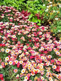 Around the peacocks, there are many types of flowers and green plants, making the area look lively and cheerful.