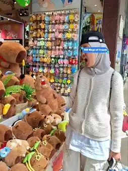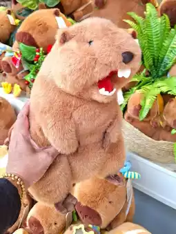 The storefront display is vibrant and colourful, with a variety of plush soft toys, particularly capybara, the brown bear-like characters creating a playful, whimsical, and welcoming atmosphere that likely appeals to both children and collectors of cute merchandise.