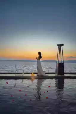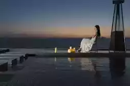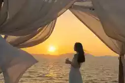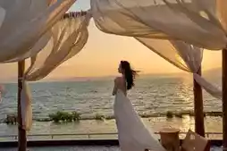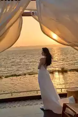 • Outfit: Light-colored long dresses like beige or champagne complement the sunset tones perfectly.