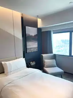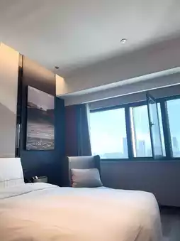 The hotel room is simple yet stylish, with stunning city views from the window🌆 The tea set and books in the room create a perfect ambiance📖 The bathroom is exquisite, with attention to detail💯