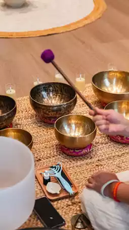 Precise 1-hour classes (morning/noon/evening options), each unique, blending essential oil therapy + singing bowl frequencies + guided energy work → Efficient stress release, focused recharging, seamlessly synced with city life.