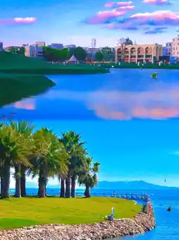 ▸ Palm trees + parasols + lake views, wear a sundress for "beach vacation" photos