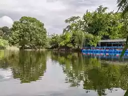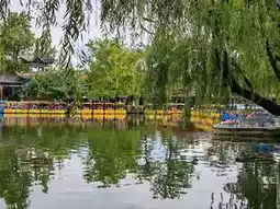 Upon entering the park, visitors are greeted by a vast expanse of serene lake water. The clear lake shimmers with gentle ripples under the breeze, while weeping willows along the shore sway gracefully as if welcoming every guest. A variety of boats—yellow pedal boats and blue electric boats—line the shore, quietly awaiting visitors and adding charm to the lake’s scenery.