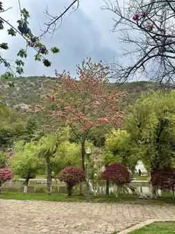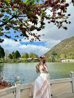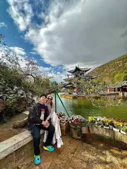 This park is famous for its clear pond that usually reflects the majestic Jade Dragon Snow Mountain 🏔️. During our visit, it had rained before, so the mountain was hidden behind the clouds. Even so, the scenery was still beautiful — we were greeted by colorful cherry blossoms in full bloom, even in early April 🌸.