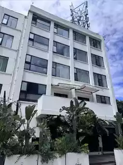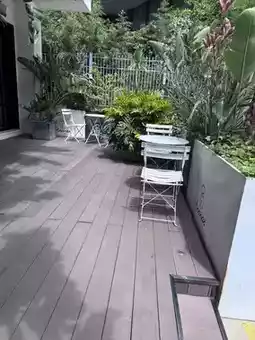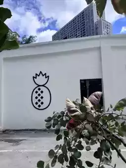 Strolling out to the outdoor terrace, you instantly fall into a tropical garden—tall cacti and broad-leaf plants layered one over another, white tables and chairs peeking through the greenery, with a pure white wall and pineapple logo in the background, fresh and photogenic. The wooden boardwalk extends deep into the greenery, and looking up reveals a sky and building skyline that seem to capture the feeling of "urban escape" in the frame.