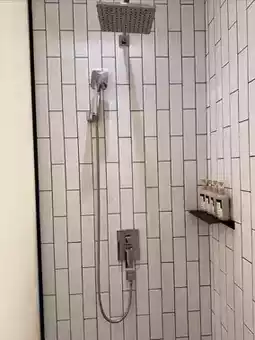 The black-and-white tiles in the bathroom collide with the round mirror to create a crisp feel, while the metal showerhead and bath amenities in the shower enhance the ritual of a “refined bath”; even the mirrored design in the corner quietly extends the visual depth of the space.