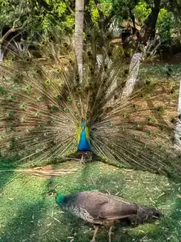 The free-range area in the peacock garden (peak chance to see the tail fan at 3 PM)