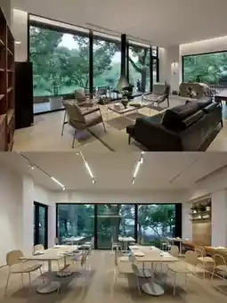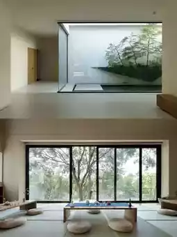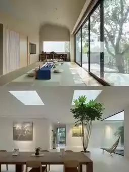 A skylight that introduces sunlight, a courtyard filled with greenery