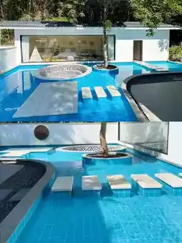 3️⃣Facilities include a long swimming pool🏊🏻♀️, a large lawn🌿, swings🪄, mahjong🀄, a tea room🍵, projection equipment🎥, KTV🎤, a self-service kitchen🥘, barbecue grills🍖, and a stove for tea-brewing🍠.