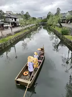 The boatman, holding a bamboo pole, introduced the beautiful history and culture of Kurashiki. He was wearing a bamboo hat. The willow trees by the river were drooping, and the white walls of the Western-style buildings and the boatman's blue denim clothes were reflected, which was very interesting.
