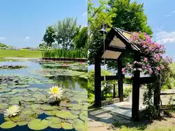 The park also features several quaint bridges spanning babbling streams. Standing on the bridge, you can feel the gentle breeze, bringing a refreshing coolness. Looking down, the clear stream reveals stones and aquatic plants at the bottom. The stream's melodious sound seems to tell ancient stories, immersing you in this serene and beautiful atmosphere, making you forget all worries and fatigue.
