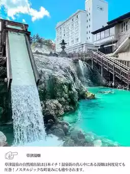 🚩 Kusatsu Onsen 𓇼 Kusatsu Onsen gushes out over 32,300 liters every minute! It has the largest natural spring water output in Japan. The Yubatake in the middle of the hot spring area is a sight to behold no matter how many times you see it! 𓇼 Kusatsu is all about the public baths! Shirahata no Yu, Chiyo no Yu, and Jizo no Yu are all free baths. There are also other bathing facilities that you can enjoy on a day trip, such as Goza no Yu, Otaki no Yu, and Sainokawara Open-Air Baths. ✨ ▧ ▦ ▤ ▥ ▧ ▦ ▤ ▥ ▧ ▦ ▤ ▥ ▧📍 Kusatsu Onsen Yubatake The symbol of Kusatsu Onsen! The water in Kusatsu Onsen is too hot at the source, so it is cooled in the Yubatake or by bathing, which has also become a tourist attraction🌼