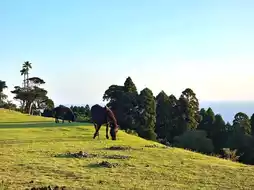 This is a sanctuary for wild horses, where the horses, grasslands, and ocean create a picturesque scene.