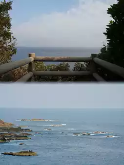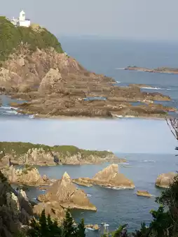🪧 Hashigui-iwa Rocks: Facing Oshima Island from Kushimoto, over 40 large and small rock pillars line up in the sea, stretching for about 850 meters. They are named Hashigui-iwa, meaning "bridge pier rocks," because their regular arrangement resembles bridge piers. Located within the Yoshino-Kumano National Park, they are designated as a national scenic spot and natural monument.