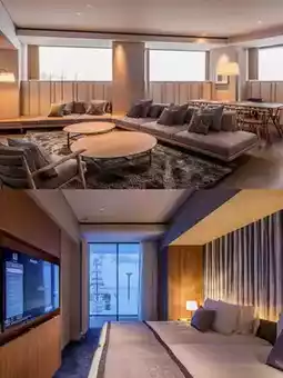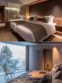 MUWA NISEKO's room types include one-bedroom rooms, two to four-bedroom suites, four-bedroom penthouses, and five-bedroom penthouses. Each room features elegant Japanese architectural style, and most rooms have a private hot spring bath and breathtaking views of the snow-capped Mount Yotei.