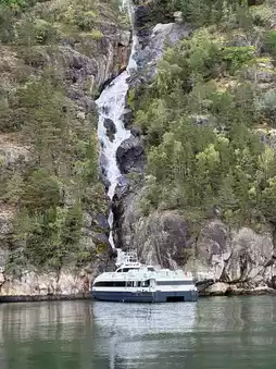 On the way, there are waterfalls flowing from the glaciers for thousands of years. The crew will take the bow of the boat directly to the waterfall and serve the glacier water for the tourists to taste. It is really sweet and refreshing, and it is good!
